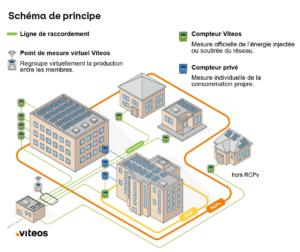 Dans ce modèle, la production et la consommation d’électricité sont mises en relation de manière virtuelle : la mesure de l’électricité des différents participants est additionnée virtuellement, permettant ainsi d’étendre le regroupement à plusieurs immeubles ou maisons d’un même quartier.